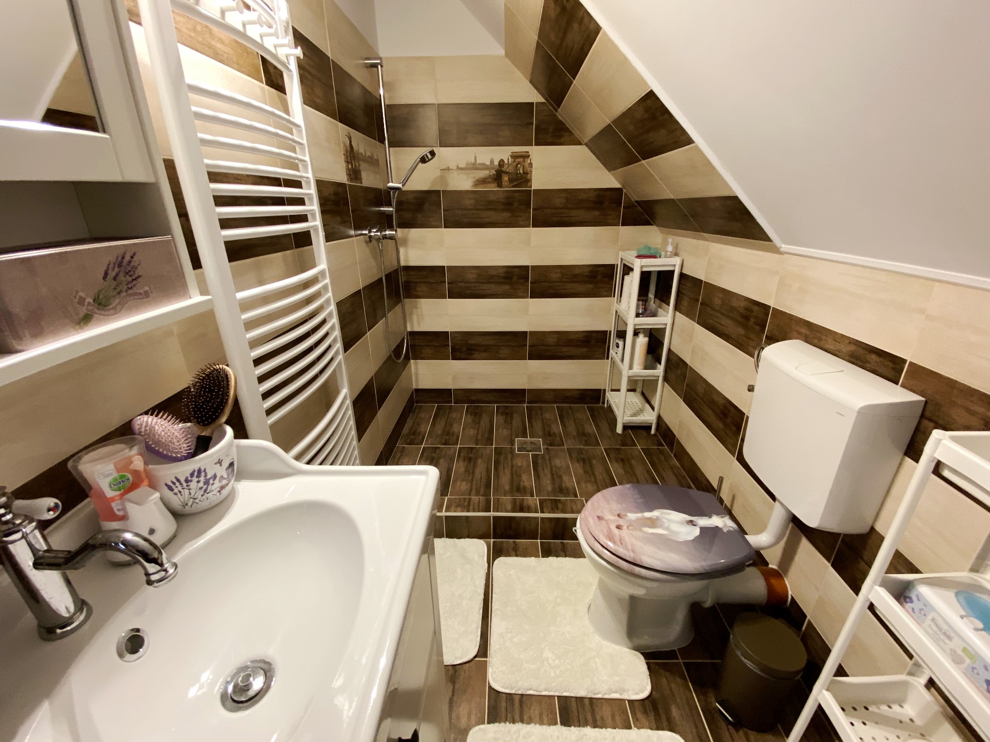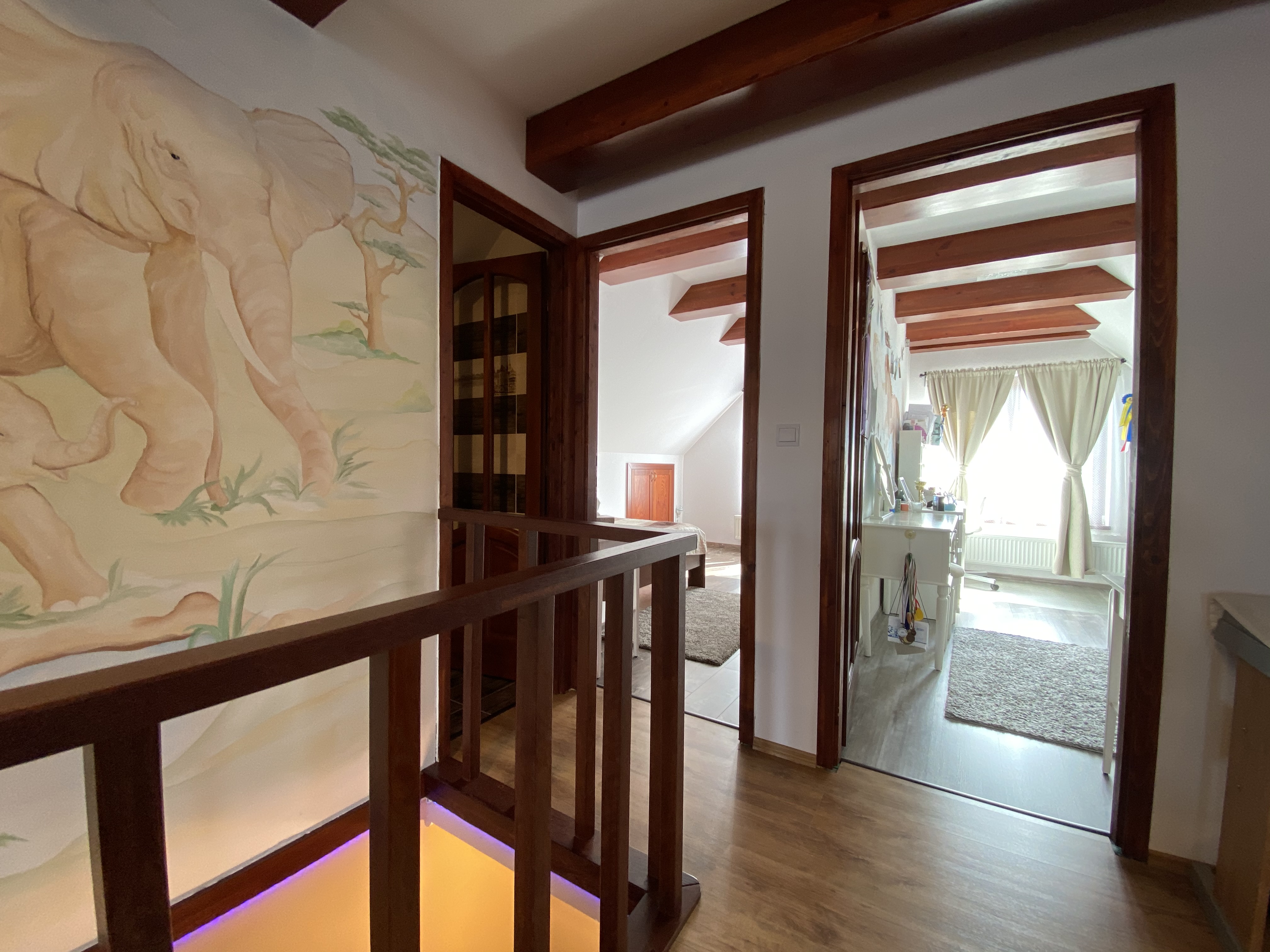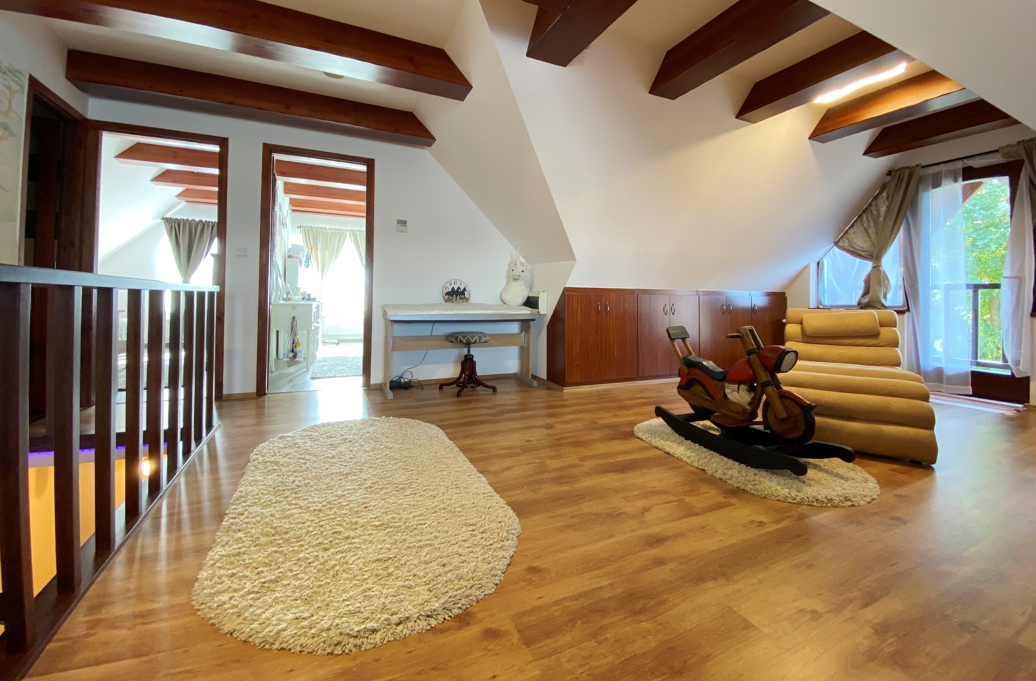 Az emeleten tágas napppali+ 2 különnyíló hálószoba, tetőterasz+erkély és egy zuhanyzós fürdőszoba került beépítésre.
