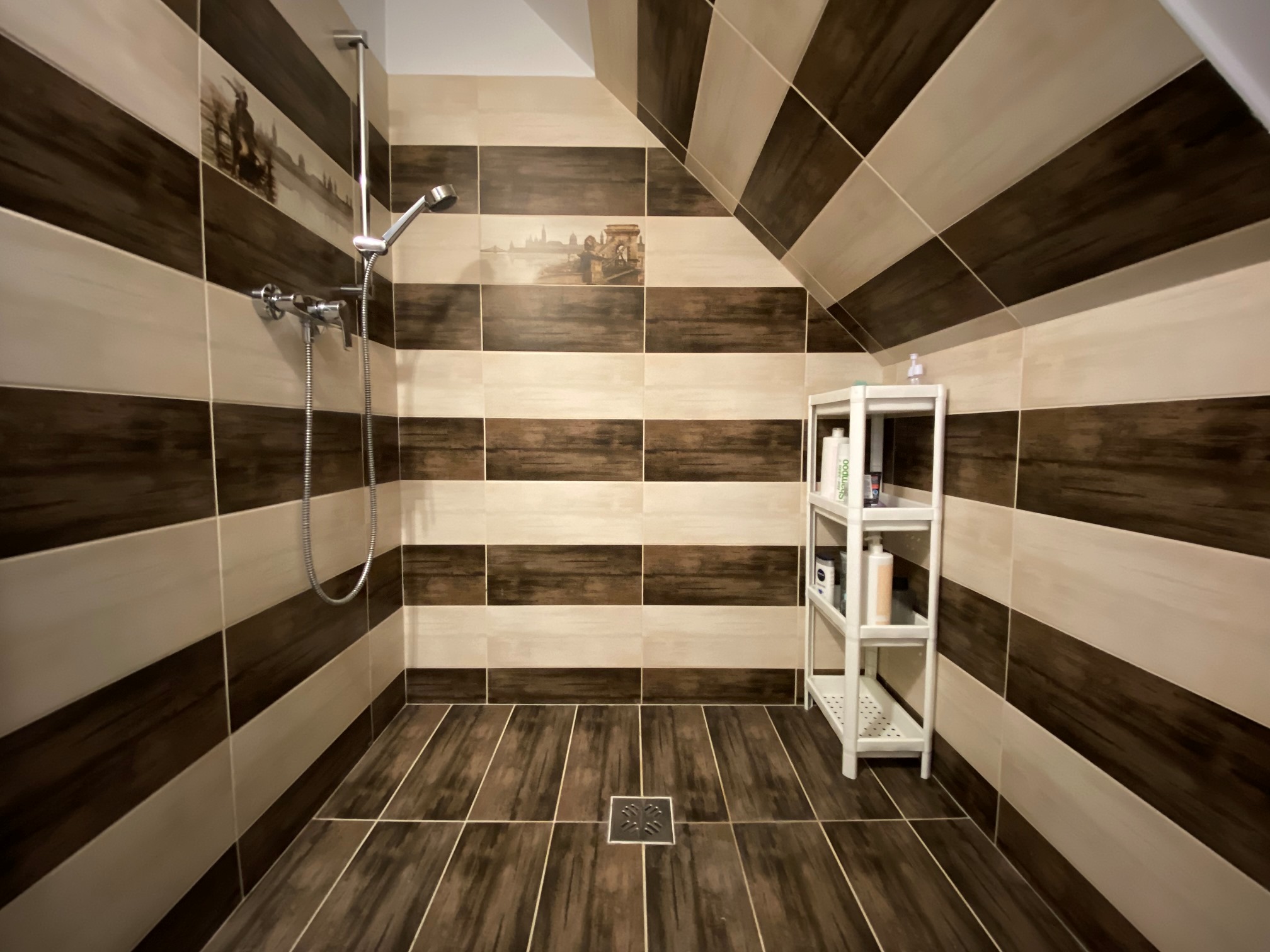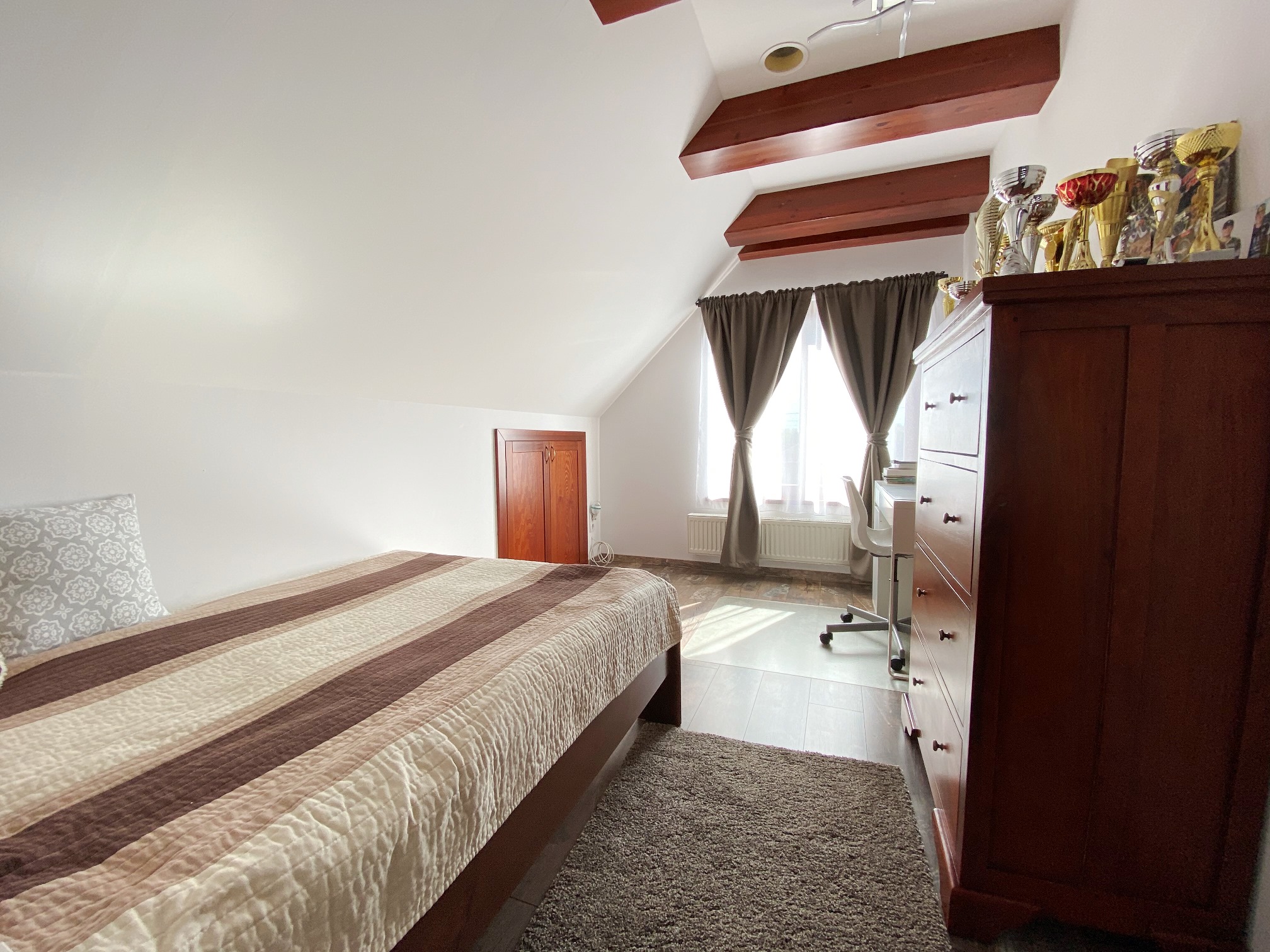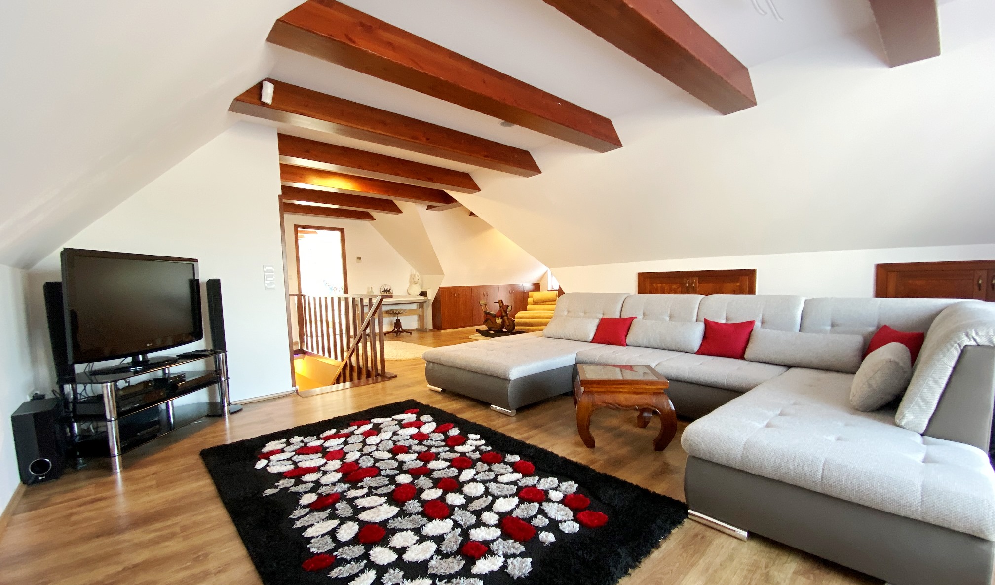 Az emeleten tágas napppali+ 2 különnyíló hálószoba, tetőterasz+erkély és egy zuhanyzós fürdőszoba került beépítésre.