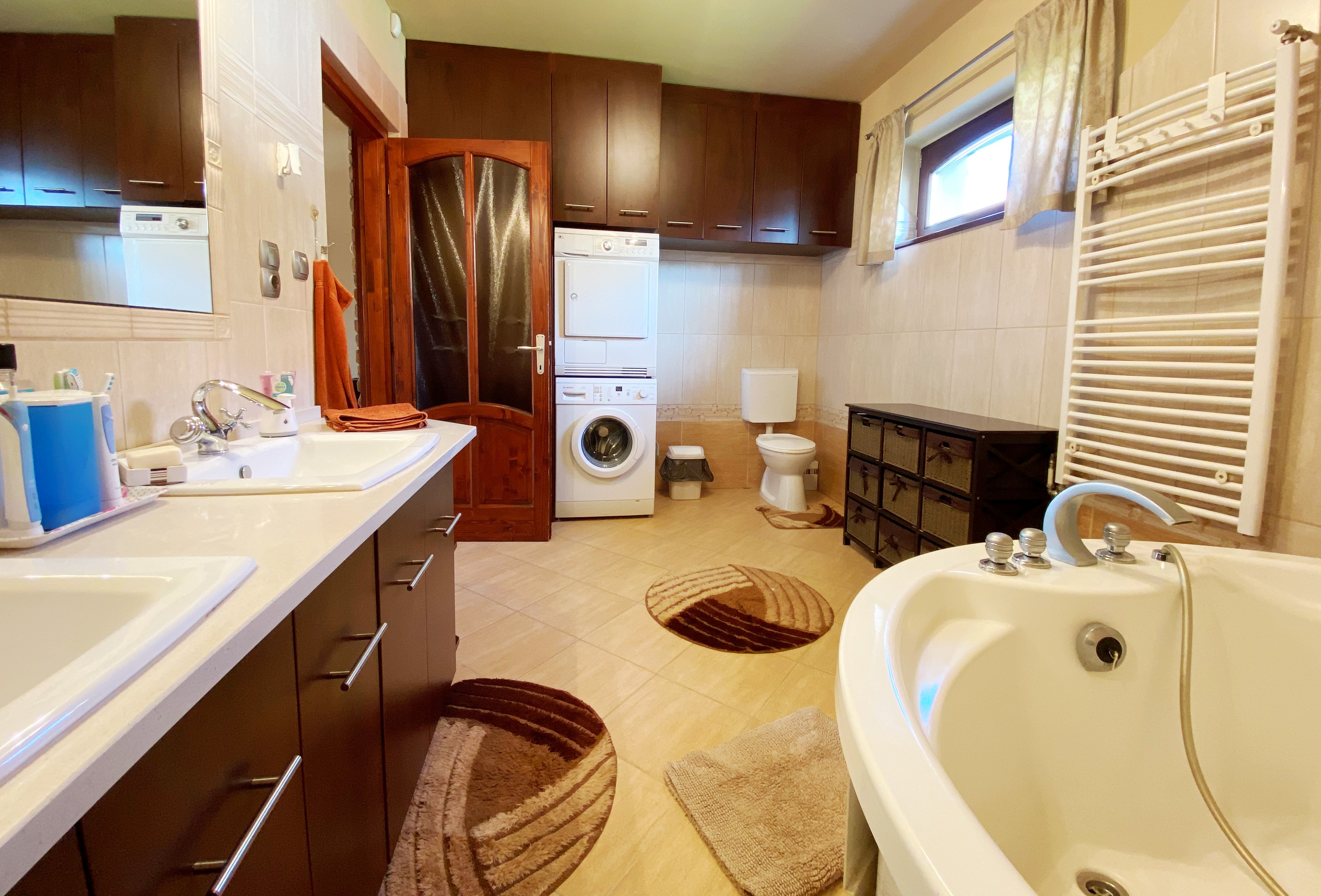 A ház fűtéséről faelgázosítós kazán gondoskodik, 3000L-es puffer tartállyal, riasztóval és inverteres klímával felszerelt és fa nyílászárókkal beépített.