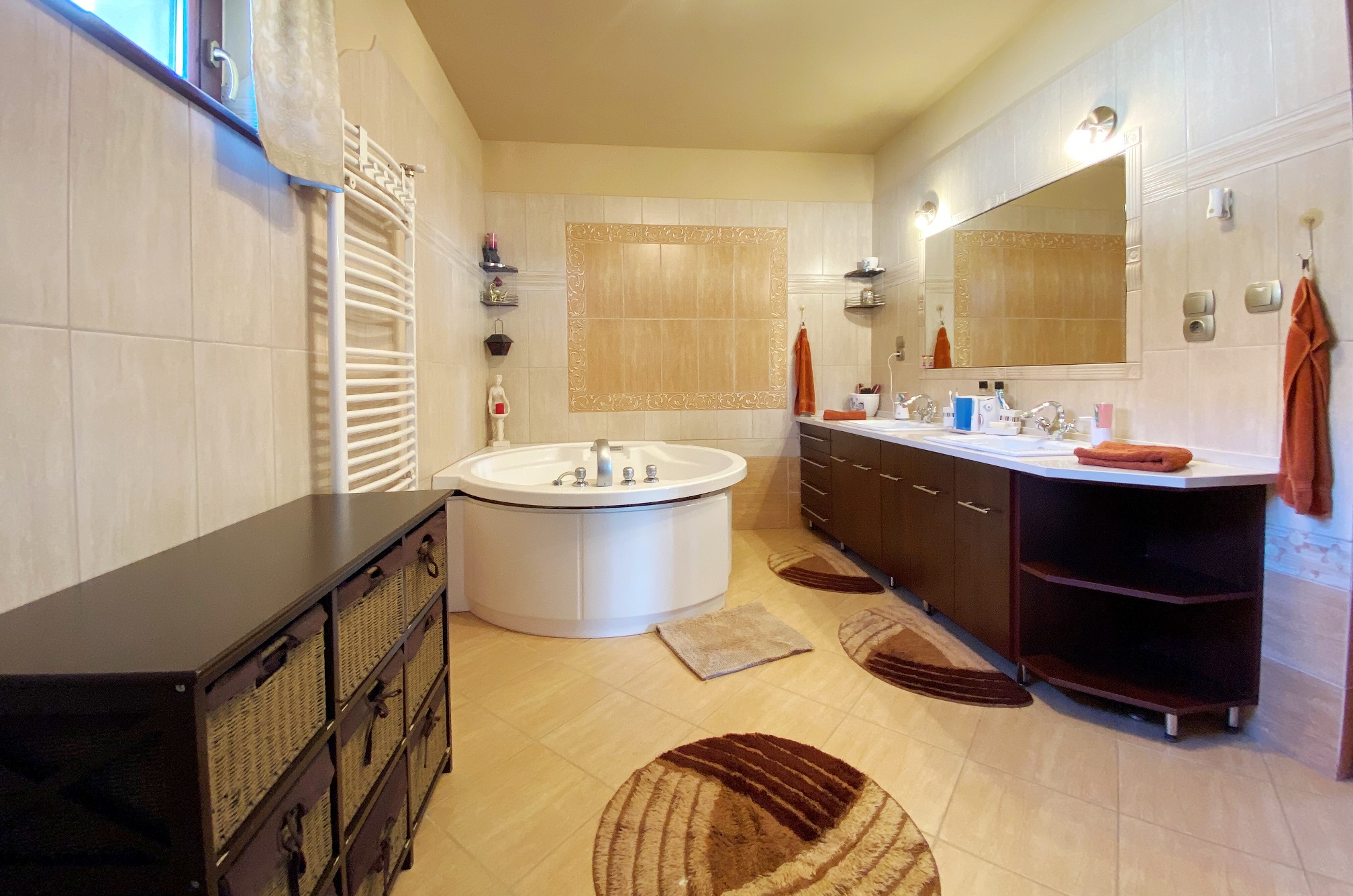 Megvételre kínálunk, Dány-Szentkirályon egy minden igényt kielégítő, kétszintes tégla családi házat, nettó 250 nm-es lakóterülettel, 3nm-es erkéllyel és 44nm-es terasszal, 2 tágas nappalival, 4 hálószobával, belső medencével, külön épületrészben, valamint egy 50nm-es masszív borospincével.